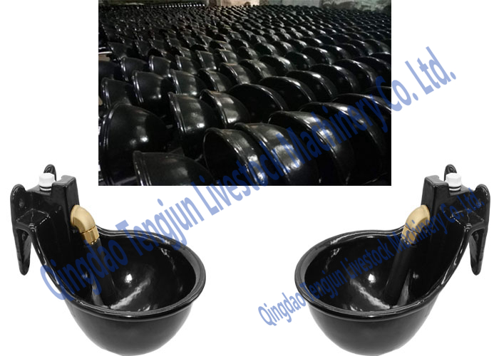 This kind of animal drinking water device usually contains a bowl, one tongue, a valve, brass and fixed device. Animal use the nose to depress the tongue ( tube valve), flesh water flow out into the bowl. Then the animals can enjoy drinking. The drinking water bowl are also called livestock water bowl, livestock waterer, livestock drinker, animal water bowl, animal waterer, animal drinker, poultry waterer, poultry water bowl, poultry water fountain, drinking water basin, water feeder, water trough, etc.It has four obvious advantages. First, the material is no harmful to animals. Second, the animals can enjoy fresh water at any time. Third, the enameled (powder coated) surface of the bowl is very smooth. No sharp edges. The last, the bowl can be placed at barn, pen, house, etc. A stable tube or a wall is OK to mount on .